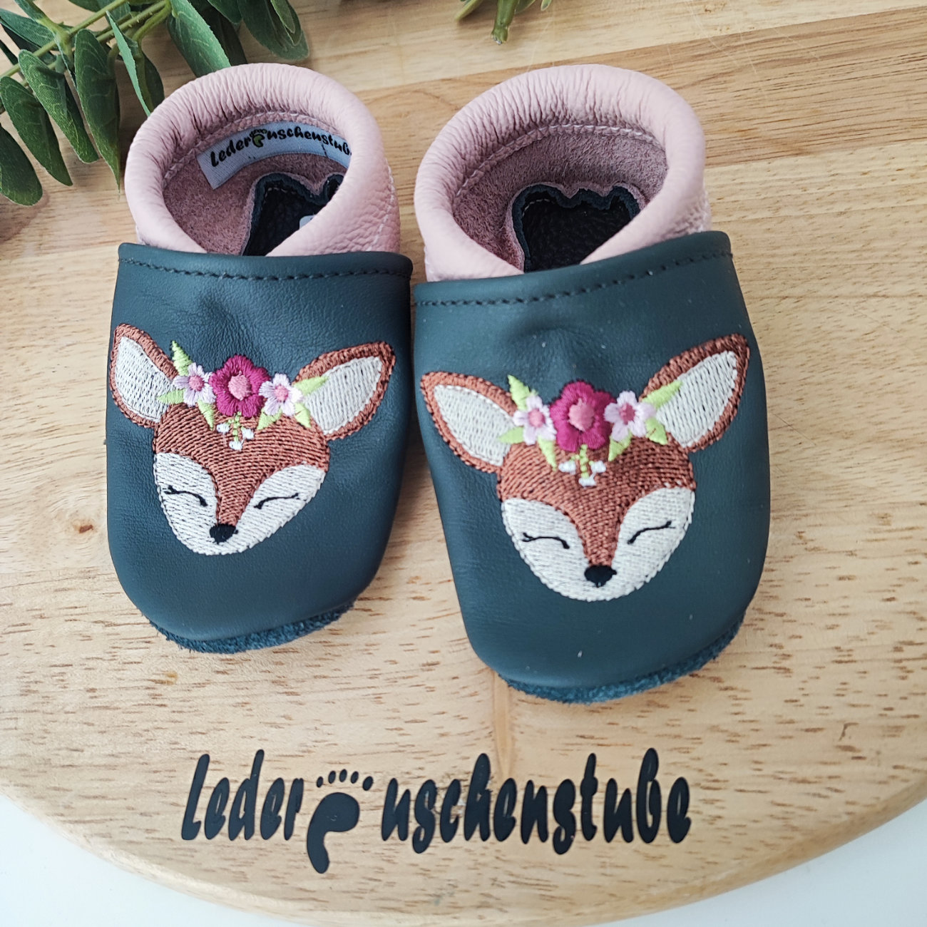Lederpuschen in schmaler Form in anthrazit-rosa mit beiderseits Boho Reh ist in Handarbeit von mir hergestellt. Sie haben die Möglichkeit an der Ferse den Namen Ihres Kindes einsticken zu lassen! Haben sie beiderseits Namen gewählt und möchten sie lieber links den Namen und rechts das Geburtsdatum/Taufdatum? Kein Problem schreiben Sie es in das Notizfeld. Schneller Versand.