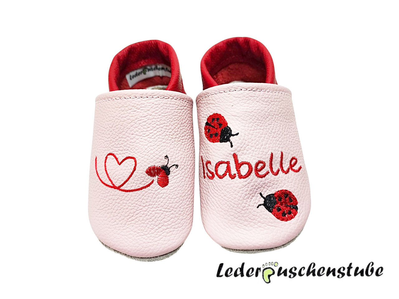 Das Motiv Käferkleinherz mit zwei kleinen Marienkäfern macht die Puschen zu einem liebevollen Geschenk zur Geburt, Taufe, Hochzeit, Geburtstag oder zu Weihnachten. Jedes Paar ist ein echtes Unikat.