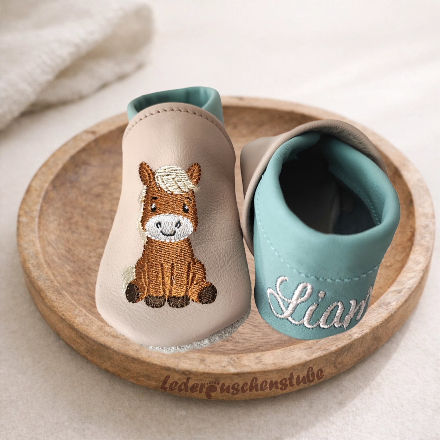 Diese liebevoll handgefertigten Lederpuschen mit dem Stickmotiv „Pony Ida“ bestehen aus weichem, hochwertigem Rindleder und werden individuell nach deiner Bestellung von mir angefertigt.
