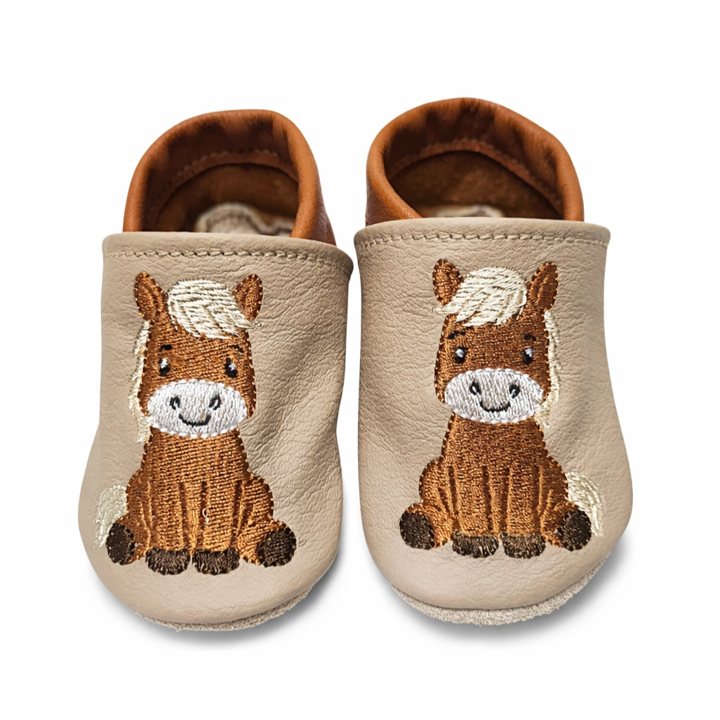 - Bild Nr. 1 bis 4: Lederpuschen beige-braun mit Stickerei Pony Ida